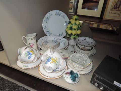 An assortment of ceramics including cups and saucers, platters,serving bowls and more.