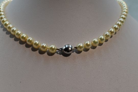 A string of cultured pearls of even cream colour with a 14ct white gold circular barrel and tongue clasp, approx 16'