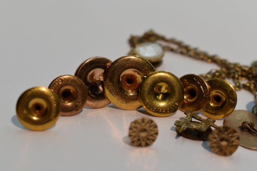 A selection of 9ct gold and yellow metal including collar studs, brooches, chain, cufflink etc