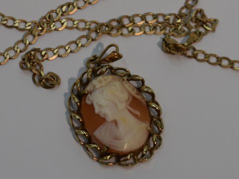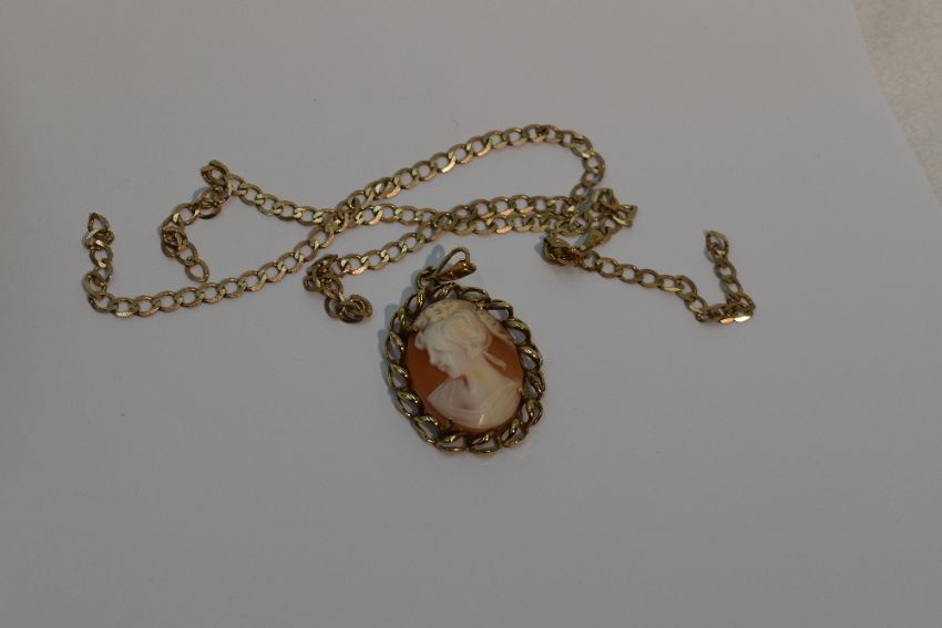 A conche shell cameo pendant depicting a maiden in profile in a 9ct gold mount with 9ct gold chain (AF)