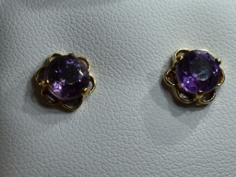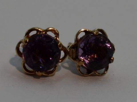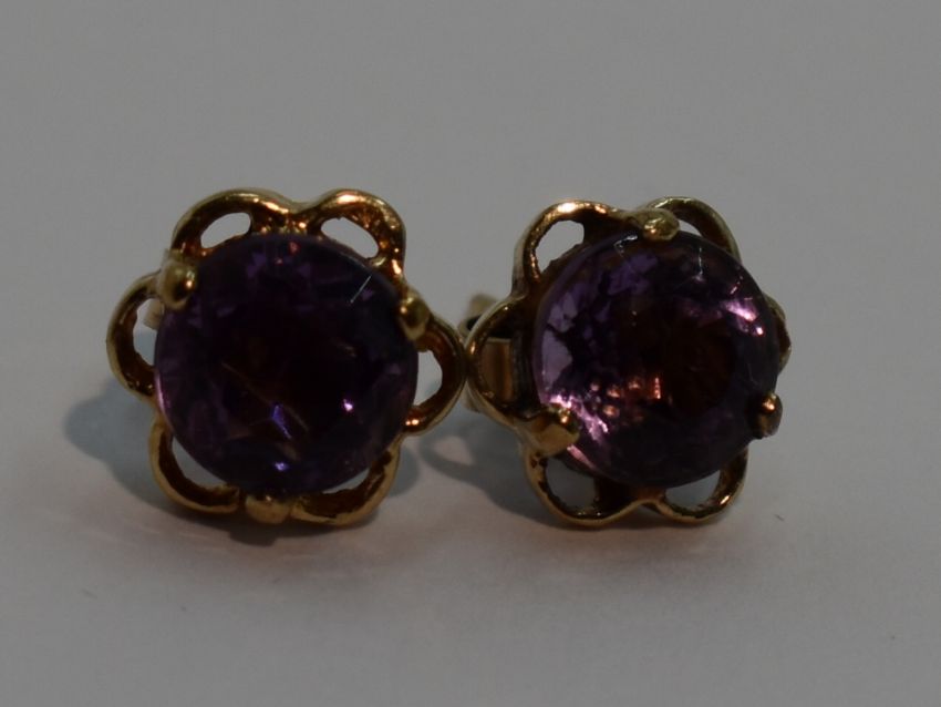 A pair of amethyst stud earrings in 9ct gold mounts