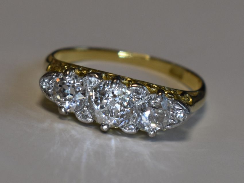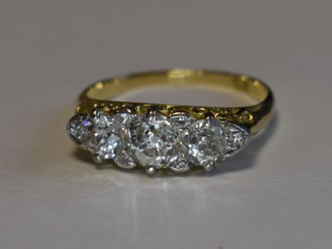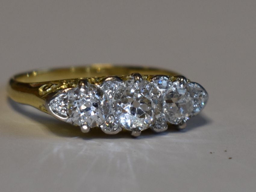 A Victorian lady's dress ring having three graduated diamonds with a border of six diamond chips, total approx 1.6ct in a moulded gallery mount on a yellow metal loop stamped 18ct, size Q