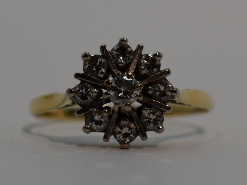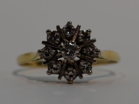 A lady's dress ring having a diamond star burst cluster, approx 0.5ct on a yellow metal loop, no marks, tested as 18ct gold, size S/T