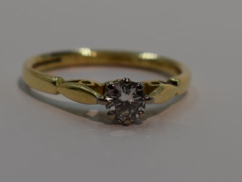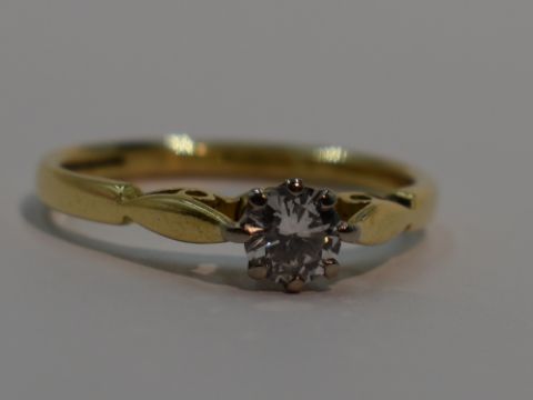 A lady's diamond solitaire dress ring, approx 0.25ct in a four claw raised mount to shaped shoulders on an 18ct gold loop, size M, with insurance certificate