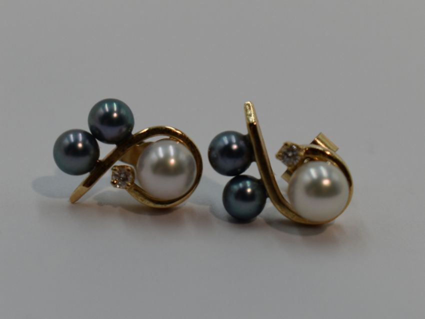 A pair of cultured black and white pearl stud earrings with diamond chip decoration in yellow metal swirl mounts stamped 14K