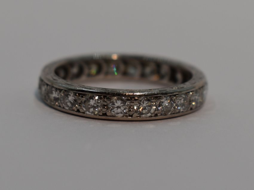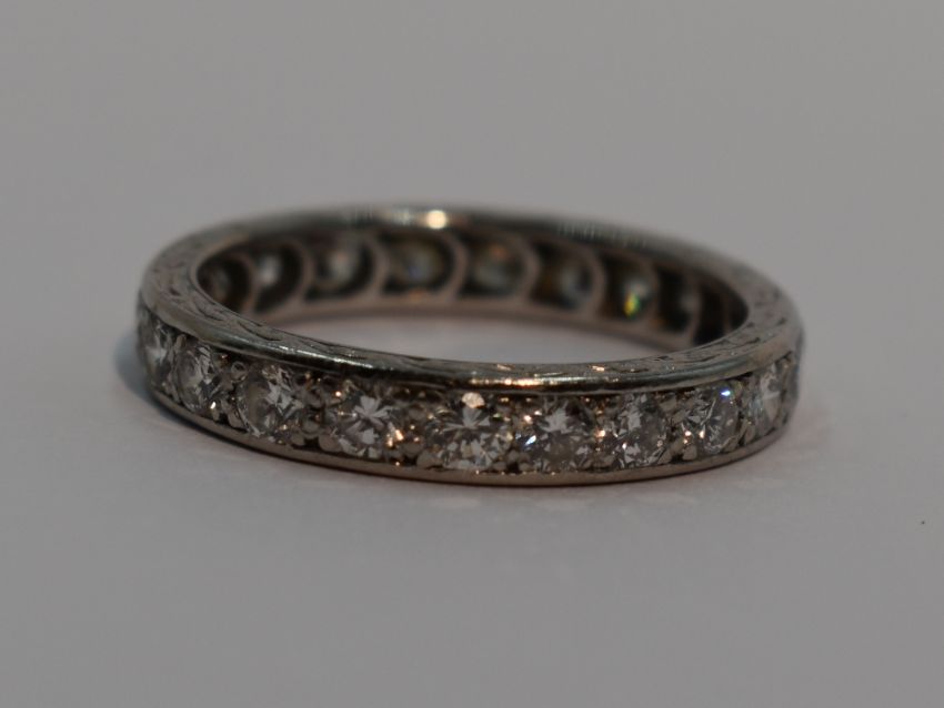 A lady's full eternity ring having 22 diamonds, total approx 1ct in a pave mount on a white metal loop, no marks probably platinum, size N/O