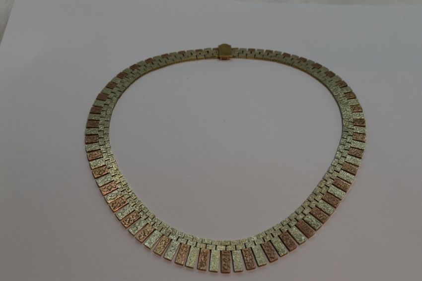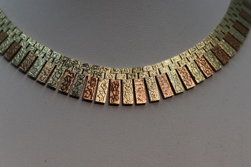 A 1970's 9ct rose and yellow gold collarette of graduated articulated form having brush effect decoration and concealed clasp, approx 65g