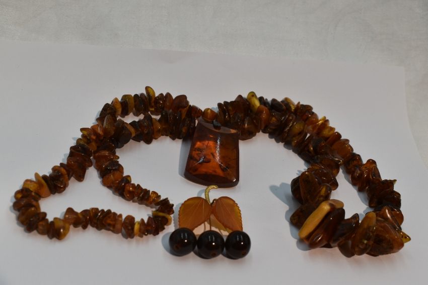 A selection of Russian amber jewellery including a brooch modelled as a trio of cherries hanging from a pair of leaves on a gold plated bar bearing marks, a string of rough cut Baltic amber and a pendant with Russian silver loop