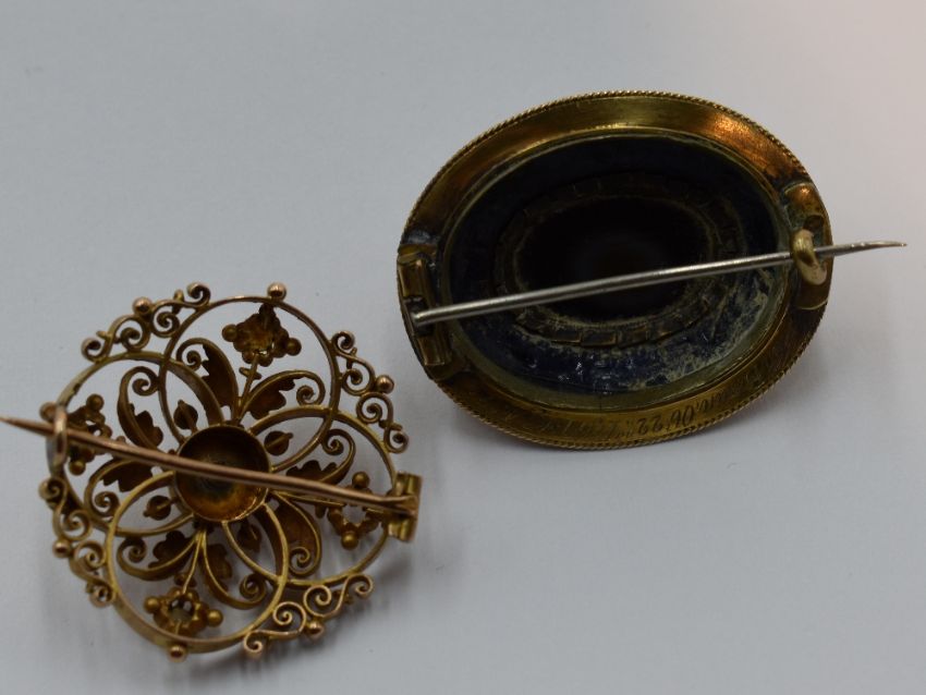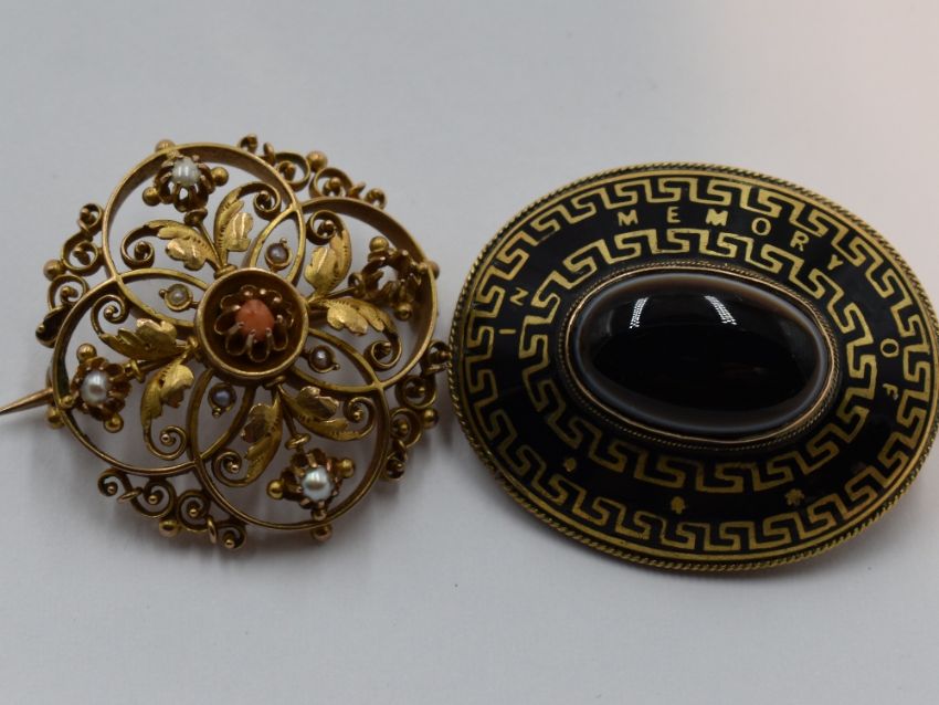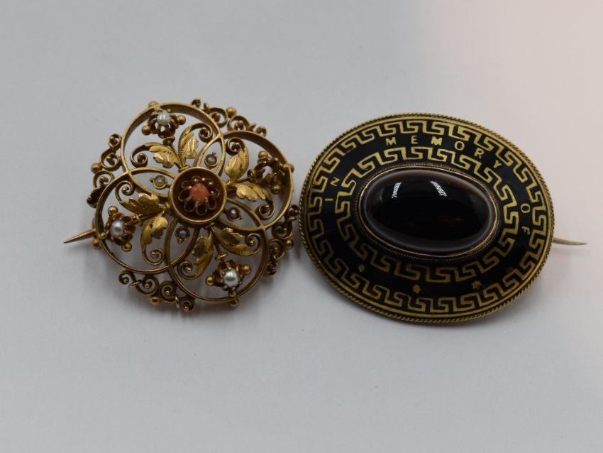 A yellow metal brooch having central coral pearl within an open foliate and scroll mount having seed pearl decoration, no marks tested as 18ct gold, and a Victorian mourning brooch of oval form having central agate within black enamel and yellow metal surround with inscription to reverse dated 1863, no marks tested as 18ct gold, GW approx13.7g