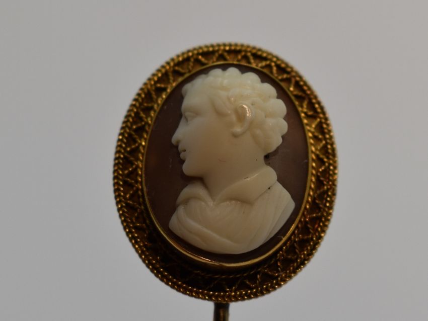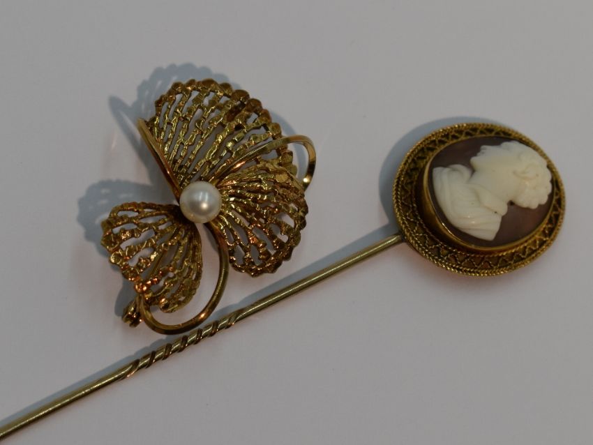 A 9ct gold brooch of stylised floral form having central cultured pearl, and a conch shell cameo pin depicting a European gent in profile in a yellow metal mount with glass locket to reverse