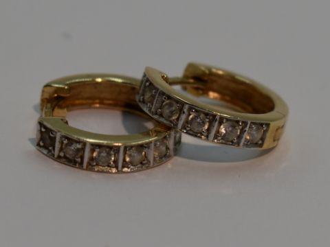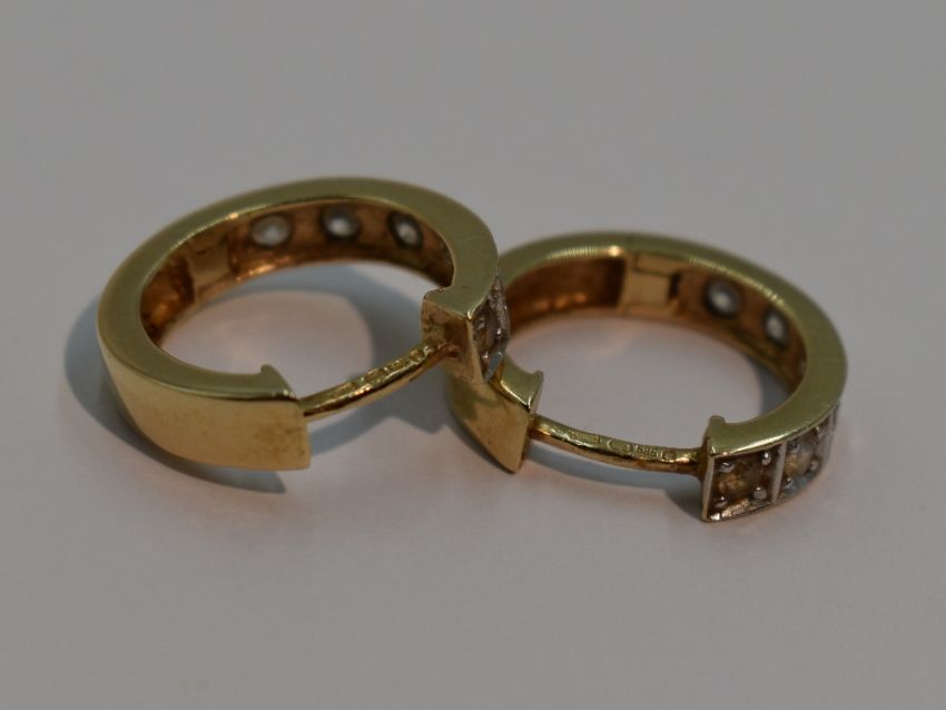A pair of hinged hoop yellow metal earrings stamped 585 each having cubic zirconia decoration