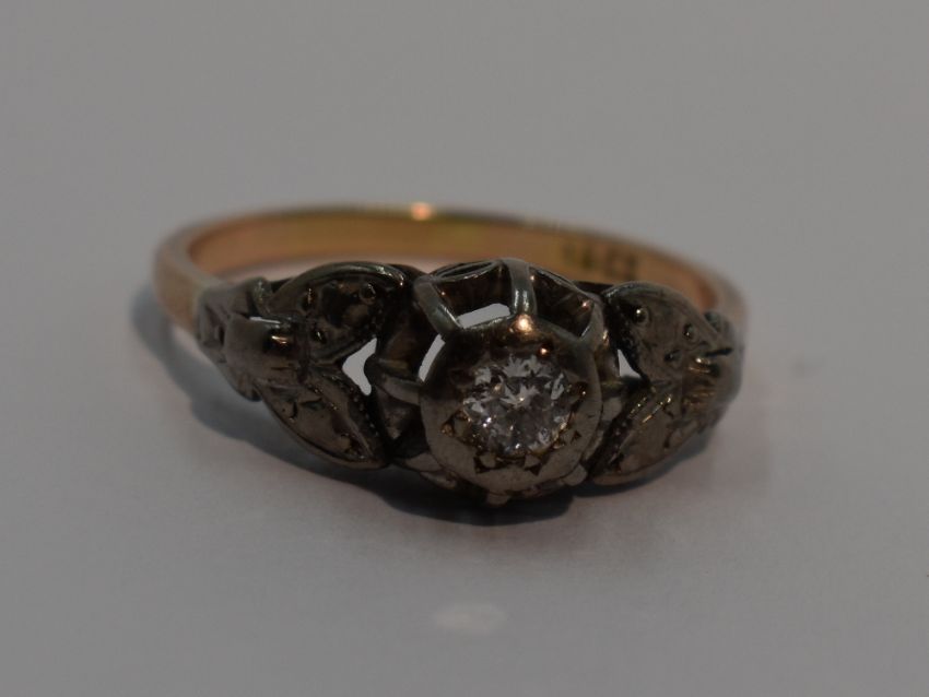 A lady's dress ring having a diamond solitaire, approx 0.25ct in an illusionary white metal mount to moulded shoulders on a yellow metal loop stamped 18ct, white metal also tested as 18ct gold, size R
