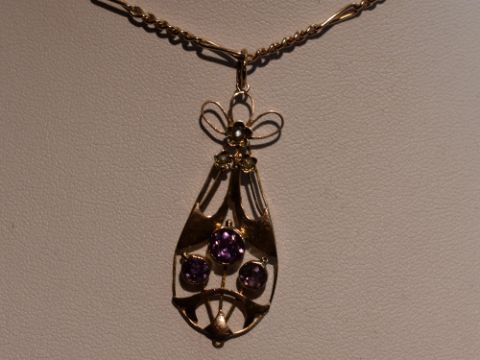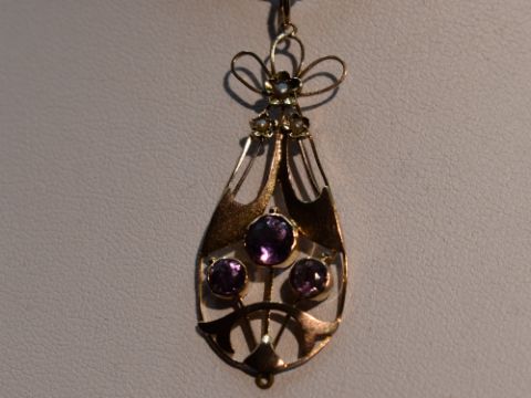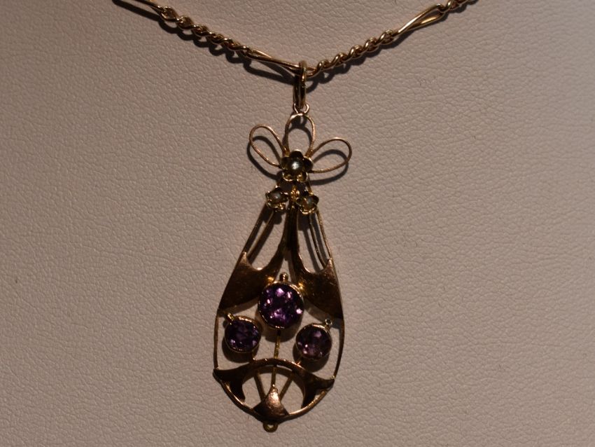 An Edwardian rose gold Art Nouveau style pendant stamped 9ct having amethyst and seed pearl decoration on a rose gold figaro link chain bearing plaque stamped 9C, approx 20' & 7.9g