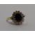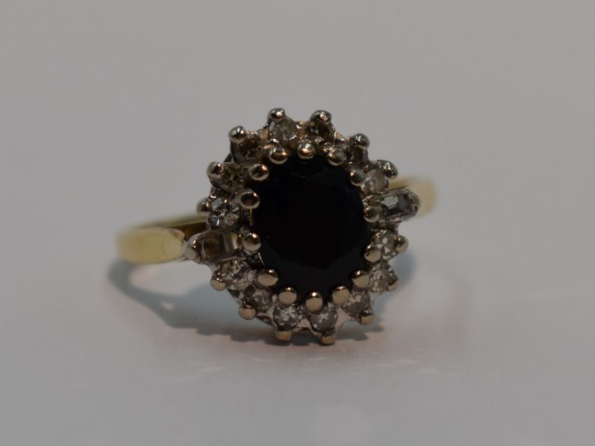 A lady's dress ring having a sapphire and diamond oval cluster having brilliant cut and baguette cut diamonds in a stepped claw set mount on an 18ct gold loop, size N, (one diamond missing)
