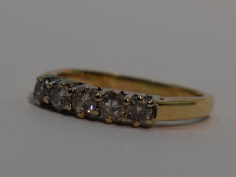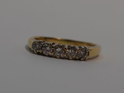 A lady's dress ring having five diamonds in a claw set raised mount on an 18ct gold loop, size M