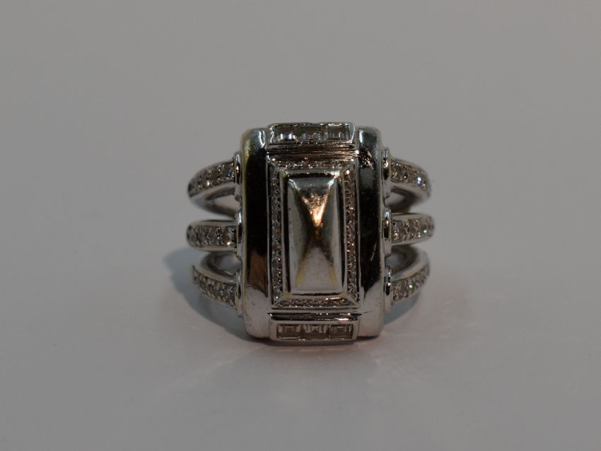 A lady's 18ct white gold dress ring by Mouawad having a large central moulded panel with diamond chip and princess cut diamond decoration to diamond set triple bar shoulders on an 18ct white gold loop, size L/M , approx 16.4g