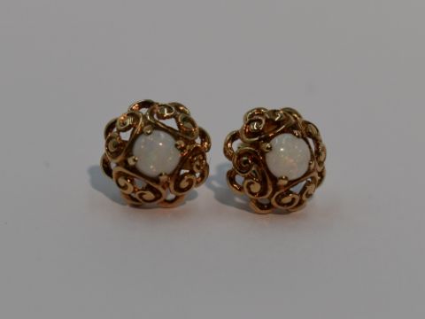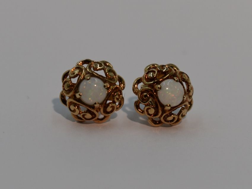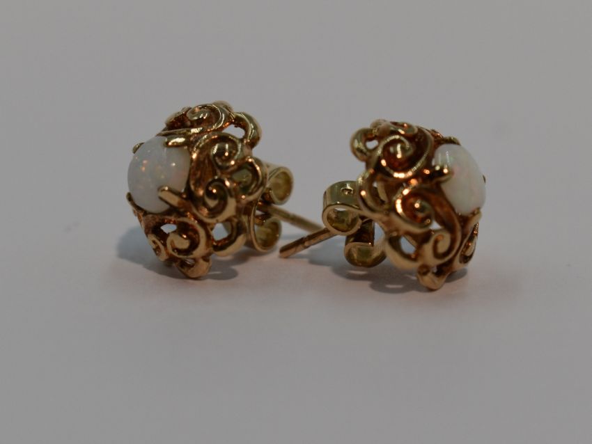 A pair of 9ct gold stud earrings having central opal cabouchons in a shaped pierced mount