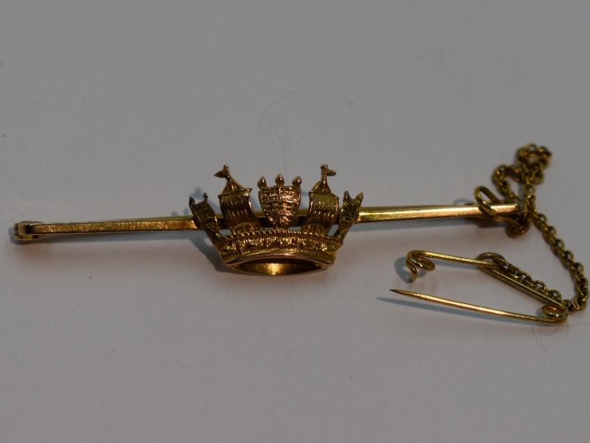 A yellow metal bar brooch stamped 9ct having a central crown, approx 3.5g