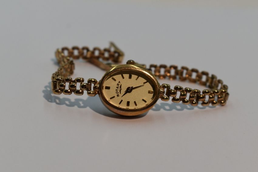 A lady's 9ct gold wrist watch by Rotary having a baton numeral dial to obval face on a 9ct gold bracelet strap