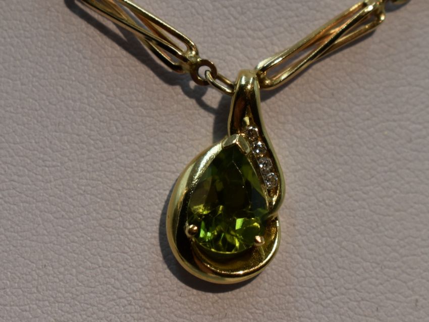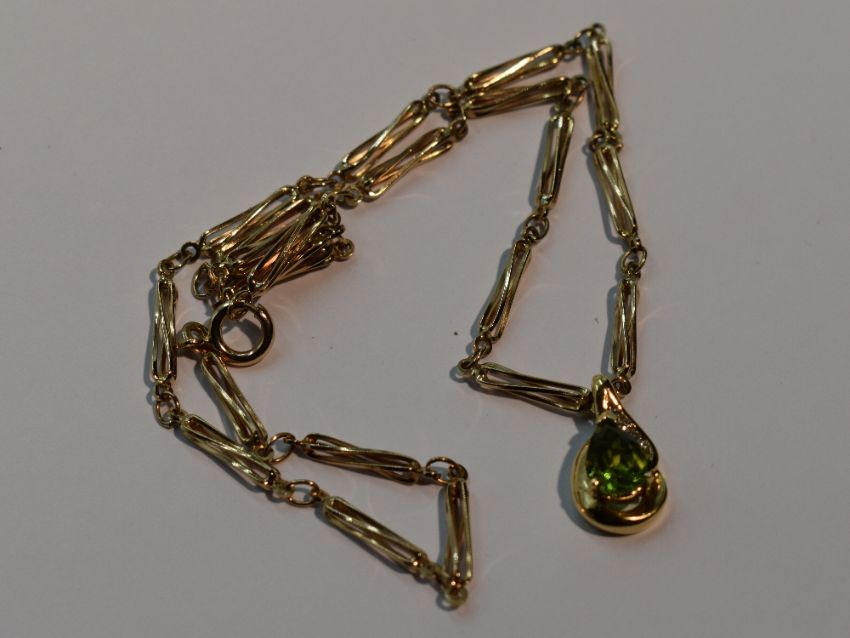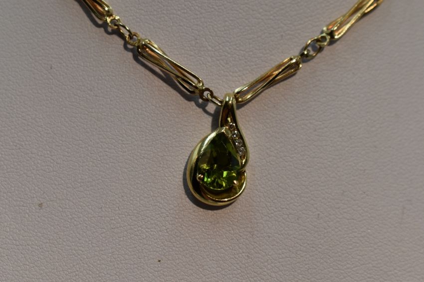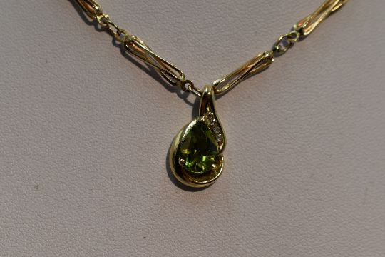 A peridot tear drop shaped pendant having diamond chip decoration in a yellow metal mount stamped 9K on a fancy link 9ct gold chain, approx 18' & 12g