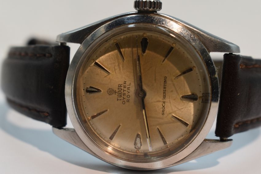A gents Tudor Oyster Royal automatic wrist watch having a baton numeral dial to champagne coloured face in a steel case bearing Rolex emblem to winder and stamped Original Oyster case by Rolex Geneva to reverse, on a replacement brown leather strap, with Rolex repair paperwork dated 1983