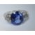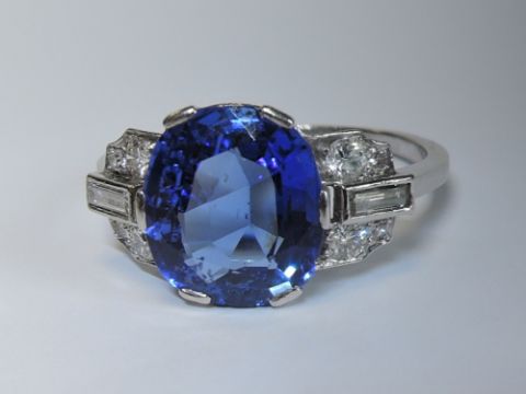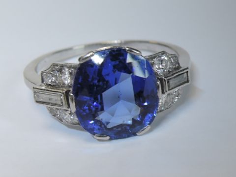 A lady's 1950's dress ring having a large central sapphire, approx 4ct in a six claw setting flanked by baguette and brilliant cut diamond set shoulders on a white metal loop, no marks, probably platinum, size Q