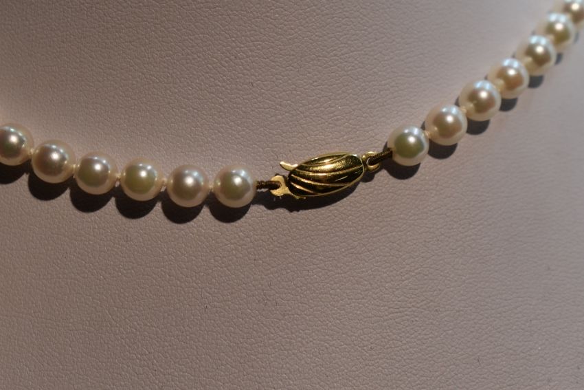 A string of cultured pearls of even ivory colour with a 9ct gold circular clasp, approx 18'
