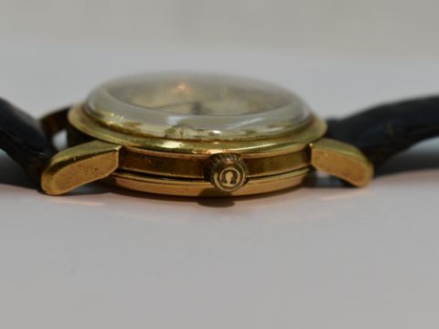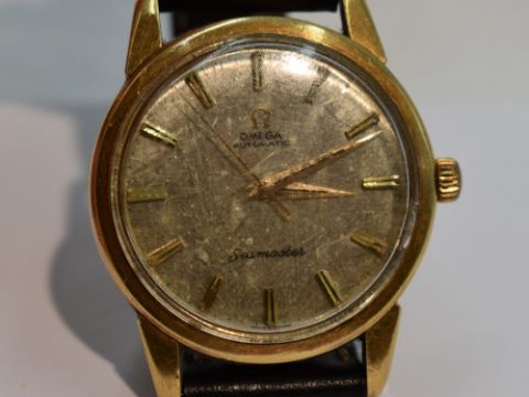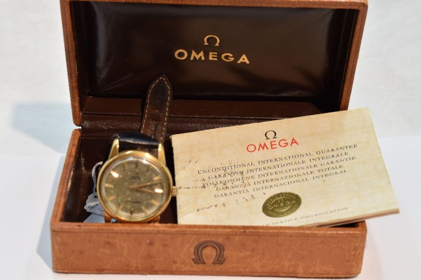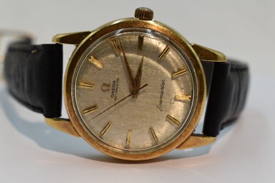 A gents 18ct gold Omega Seamaster automatic wrist watch no: 18293220, having a baton numeral dial to silvered face in a plain 18ct gold case on a later leather strap, with original box, receipt and guarantee card dated 1964.