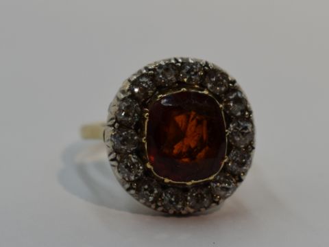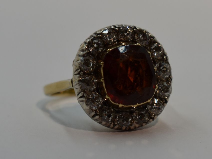 A lady's dress ring having a diamond and spinel style stone cluster, diamonds total approx 0.7ct, in a claw set basket mount on an 18ct gold loop, size N/O (damage to central stone)