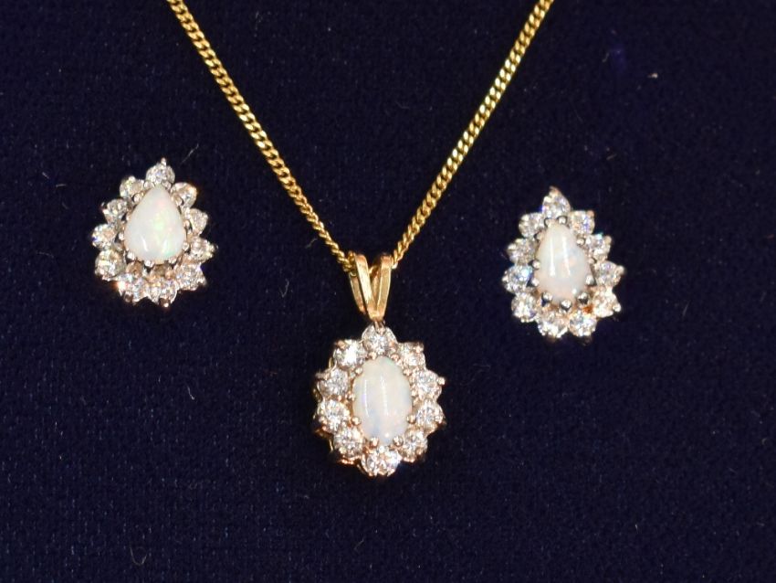 An opal and cubic zirconia oval cluster pendant on a 9ct gold chain, approx 17' with matching stud earrings
