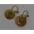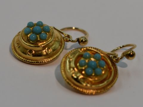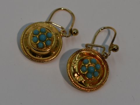 A pair of 9ct gold drop loop earrings of circular form having turquoise decoration