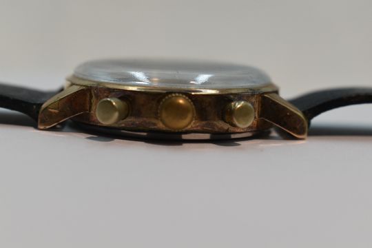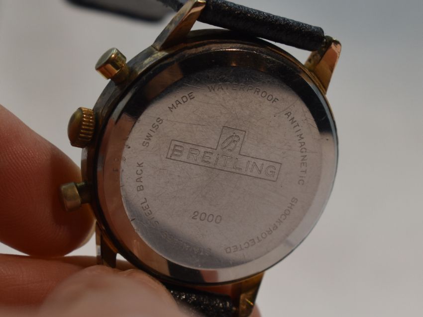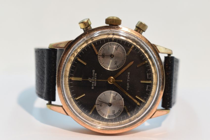 A gent's 1960's Breitling Top Time Chronograph wrist watch having a baton numeral dial with perimeter dial and two silvered subsidiary dials to black face on a black leather strap