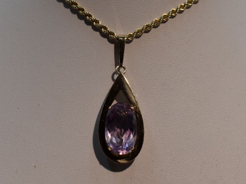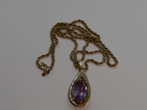 A large amethyst pendant in a yellow metal tear drop shaped open mount stamped 9ct on a 9ct gold rope chain, approx 24' & 21g