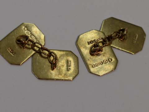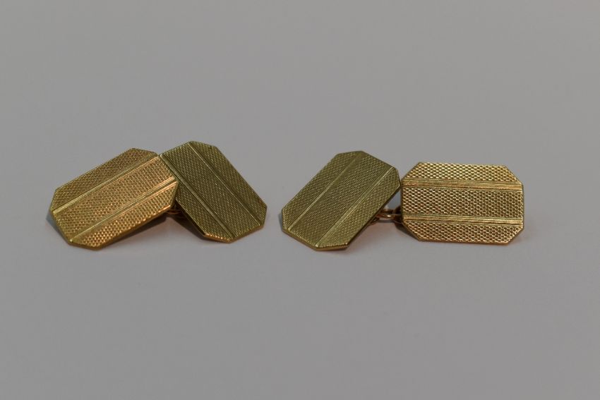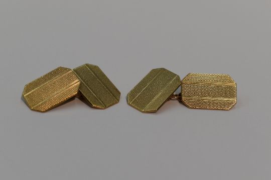 A pair of 9ct gold cufflinks of canted oblong form having engine turned striped decoration and chain connectors