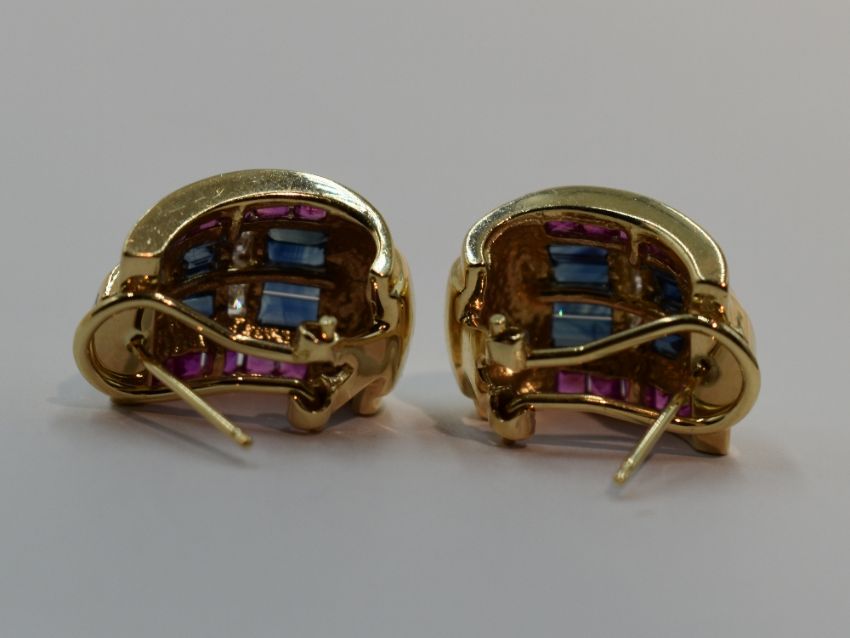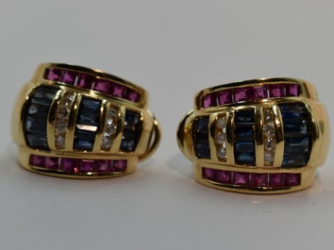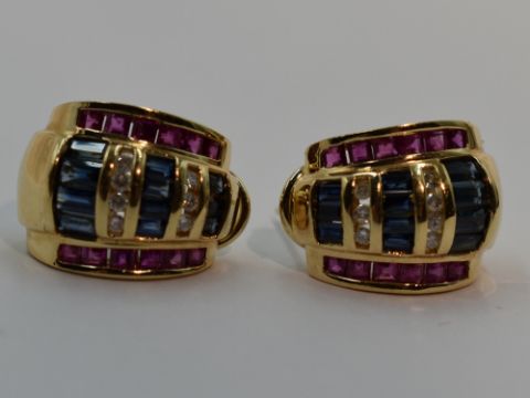 A pair of yellow metal stud earrings stamped 14K having clip butterflies and set with three rows of sapphires interspersed by two rows of bright cut diamonds bordered by two rows of rubies