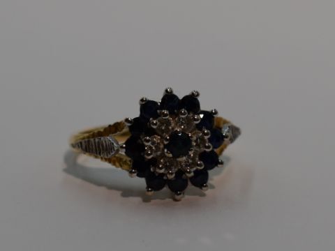 A lady's dress ring having a sapphire and diamond triple cluster to open raised shoulders on an 18ct gold loop, size O