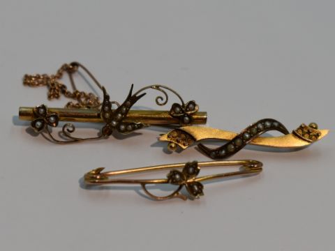 Three yellow metal bar brooches stamped 9ct having seed pearl decoration (AF)