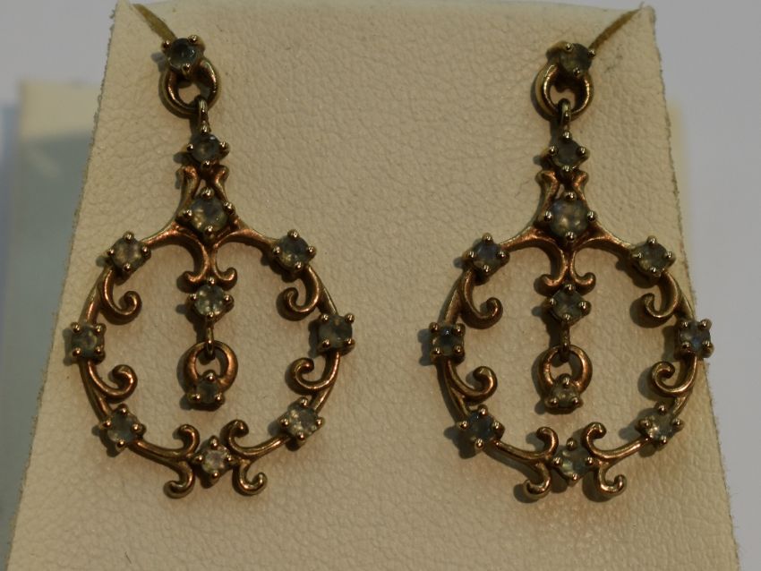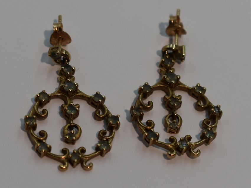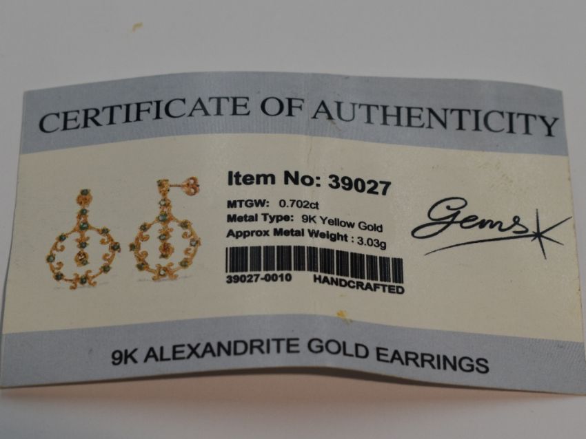 A pair of 9ct gold stud earrings having ornate drops with alexandrite stone decoration, with Gems TV card