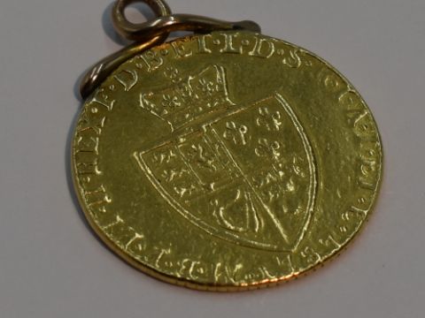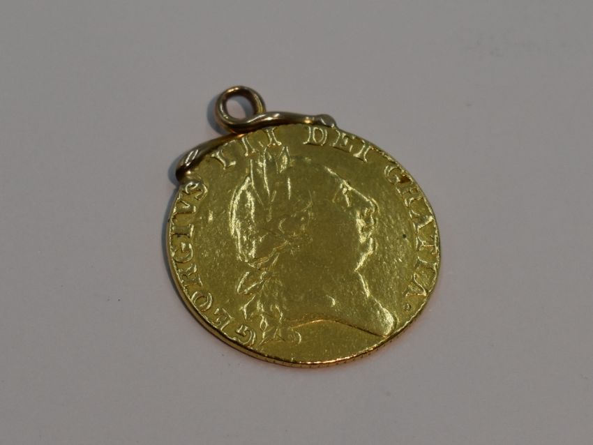 A George III 1787 gold spade guinea with fixed pendant mount, approx 9g