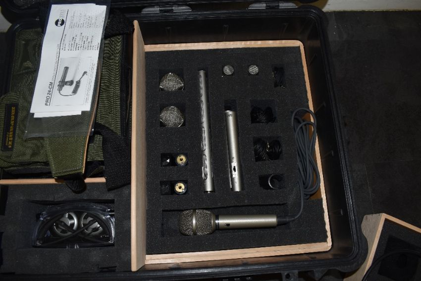 Two hard Peli 1600 cases of film sound equipment. In box one, a Marantz PMD671 professional Solid State digital sound recorder, a Senneiser shotgun microphone, two JVC M-510 small diaphram electret condenser microphones, a Realistic Cardioid Dynamic Microphone 33-1071, a set of Sennheiser headphones, four SanDisc Ultra II 1gb Compact flash cards. In box two, two Rycote Microphone Wind shields, several Rycote Hi Wind covers, a pair of Sennheiser HD212 Pro headphones and a Rode Boom Pole