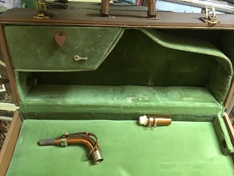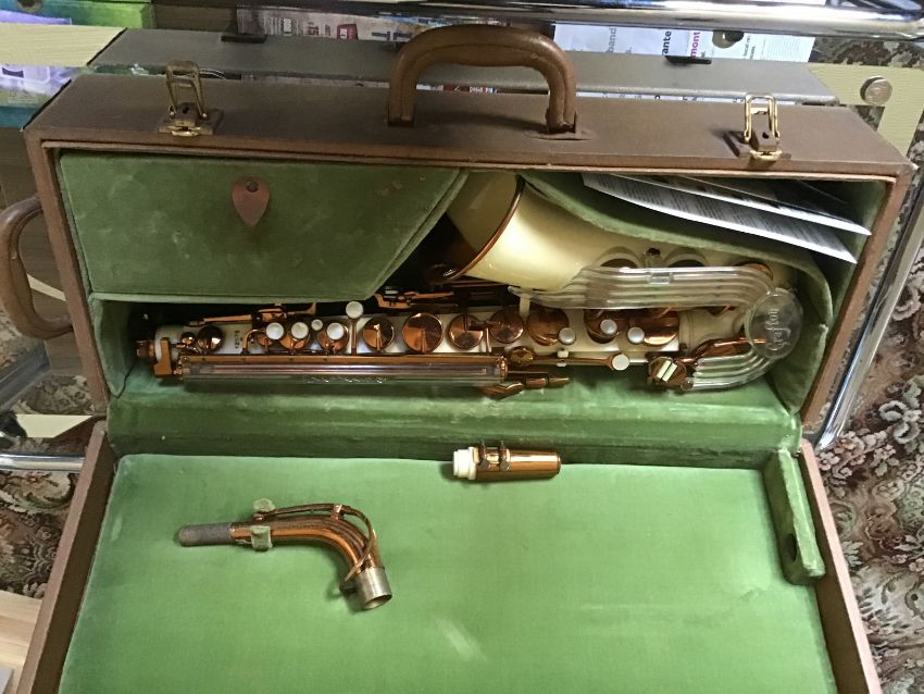 1950s Grafton injection moulded cream coloured acrylic plastic Alto Saxophone - Serial no. 12575, with gold-coloured keys and Dearman Super mouthpiece, manufactured by the Grafton Company and distributed by John E. Dallas & Son Ltd., in a fitted case CONDITION REPORT - There is slight tarnish on some bits of metal but the actual body is in great condition and has never been repaired