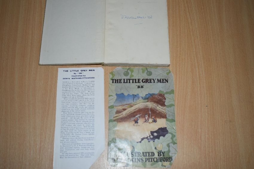 Children's. 'BB' [Denys Watkins-Pitchford]. The Little Grey Men. London: Eyre and Spottiswoode. 1942, 1st. Signed by author twice, once to f.f.e.p. and again on half-title. Remains of dust wrapper present. Front inner-hinge split opposite title. Otherwise a 'Good' copy. (1)