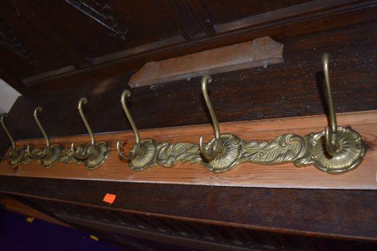 A double set of brass coat rails, mounted on skirting board