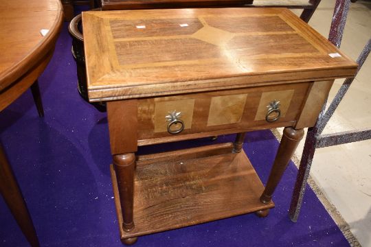 A modern hardwood side table, having deep frieze drawer, lined with script referring to Mr Baker's Mango timbers , width approx. 70cm