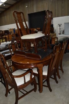 A modern Oriental hardwood bookcase having brass clasps and handles, width approx. 160cm height 210cm, and a modern Oriental extending dining table and eight (six plus two) chairs