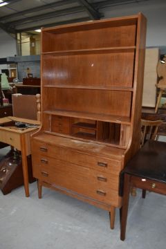 A mid 20th Century Danish teak burea bookcase having tambour shutter and compartmental interior, stained and in need of restoration with manufacture marks to reverse