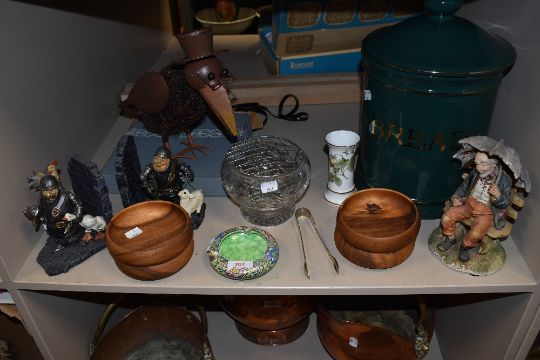 A mixed lot of items including wooden bowls,ceramic bread bin, Maling ware ashtray and more.