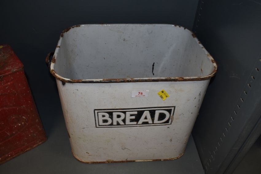 A vintage enamel bread bin with name badge