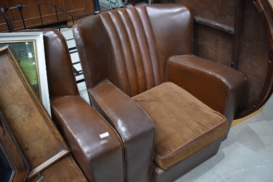 An Art Deco brown three piece suite comprising settee and two chairs, settee width approx. 137cm