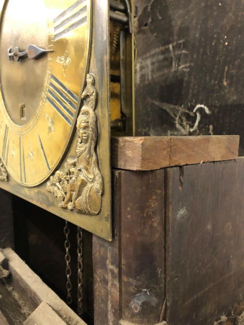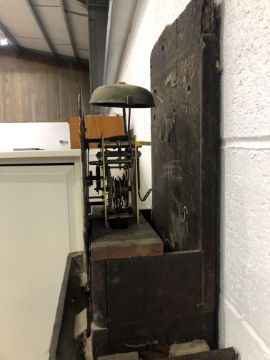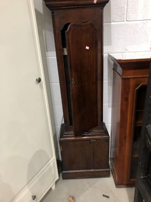 An oak long case clock, having brass dial with 30 hour movement, named Lomas , Poolton, with figural decoration, sold as found due to age and nature, pendulum and weight present, approx dimensions height 200cm, width at top 56cm